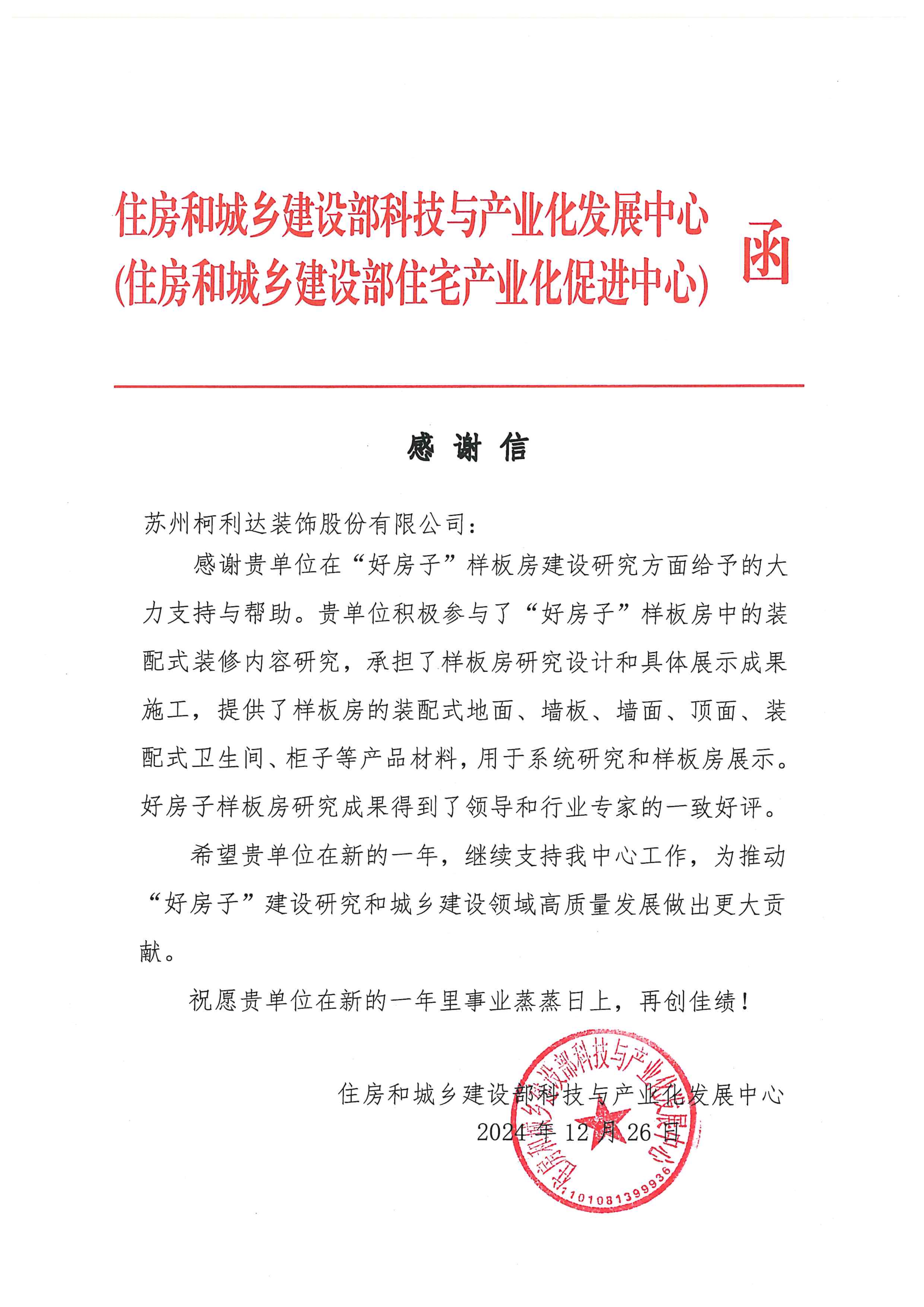 新歲漸近,祥光煥彩。在辭舊迎新之際,柯利達(dá)收到來自住房和城鄉(xiāng)建設(shè)部科技與產(chǎn)業(yè)化發(fā)展中心發(fā)來的感謝信,對(duì)公司在“好房子”樣板房建設(shè)研究方面給予的大力支持與