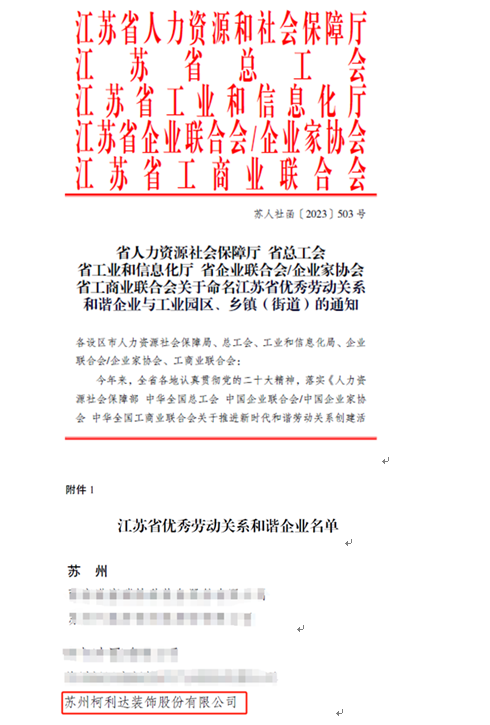 喜報!柯利達榮獲“江蘇省優秀勞動關系和諧企業”